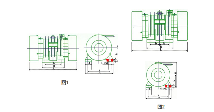 | 型號 | 激振力 KN | 額定功率 KW | 額定電流 A | 振動次數 次/分 | 安裝型式 | L | B | b | A | a | h | H | G | J | d | 圖 |
