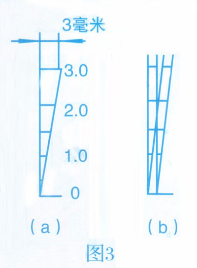 (1)振幅的測量振幅指示牌如圖3(a)所示,只是部分為一直角三角形。當指示牌與槽體一起振動是,由于視覺暫留,直角邊與斜邊形成一個交點,其交點所對應的標尺數(shù)即為被測槽體的雙振幅。當雙振幅為2毫米時,交點就對應在標尺2處,如圖3 (b)所示。
